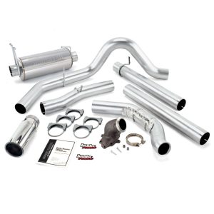 F-250 & F-350 PICKUPS and EXCURSIONS: Banks 4 inch Monster turbo-back stainless steel exhaust features streamlined turbine-outlet pipe, intermediate pipe and tailpipe all formed of stainless, heavy-wall tubing with constant-diameter bends to maximize flow, lower exhaust gas temps and slash backpressure up to 81%. (Available with or without a cast, large-bore Power Elbow housing). Designed to retain stock catalytic converter. The polished-stainless Monster muffler features a straight-through 4 inch diameter flow-path with a Banks-designed expansion chamber to dissipate the annoying mid-range exhaust drone that affects most straight-through designs. The muffler utilizes spun ceramic, very-high-temperature packing, more than doubles stock exhaust flow, and delivers an authoritative – but never intrusive – exhaust sound. And the 5 inch polished rolled-edge tip has an adjustable clamp for positioning on tailpipe. Get it in your choice of chrome-over stainless or high temp black! See this system with the black tip and no Power Elbow. (And to help keep it looking good, there’s a 1/2 inch air gap to keep heat from tarnishing the finish). Important: Some vehicle configurations require an extension kit for proper fit. Pickups other than standard-cab long-bed or extended-cab short-bed require Exhaust Extension Kit. Extended Cab Long Bed #53517 required, Crew Cab Short Bed #53516 required, Crew Cab Long Bed #53518 required.